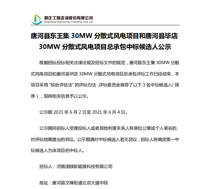 唐河縣東王集30MW分散式風(fēng)電項(xiàng)目和唐河縣畢店30MW分散式風(fēng)電項(xiàng)目總承包中標(biāo)候選人公示