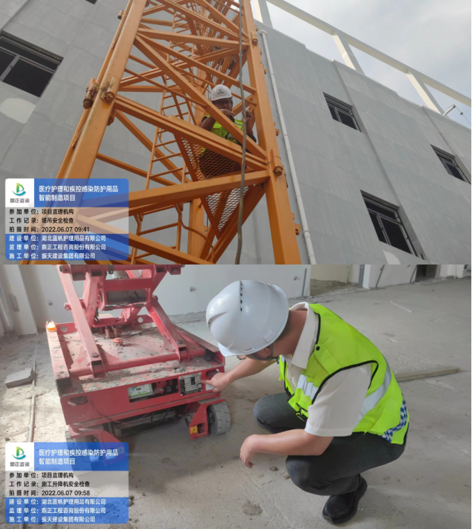 6月7日,醫(yī)療護理和疾控感染防護用品智能制造項目總監(jiān)理工程師陳雄對施工現(xiàn)場進行塔吊、物料提升機、施工升降機、吊籃、臨時用電進行聯(lián)合檢查,現(xiàn)場抽檢施工單位的安全生產規(guī)范。此次檢查以安全生產細化管理為要求,以查隱患、找短板、促整改、防事故為目的。安全是確保工程質量的前提條件,質量是建設單位所追求的最終目標,安全則是實現(xiàn)這一目標的基本環(huán)境條件,安全監(jiān)理是這一環(huán)境條件的保護神。