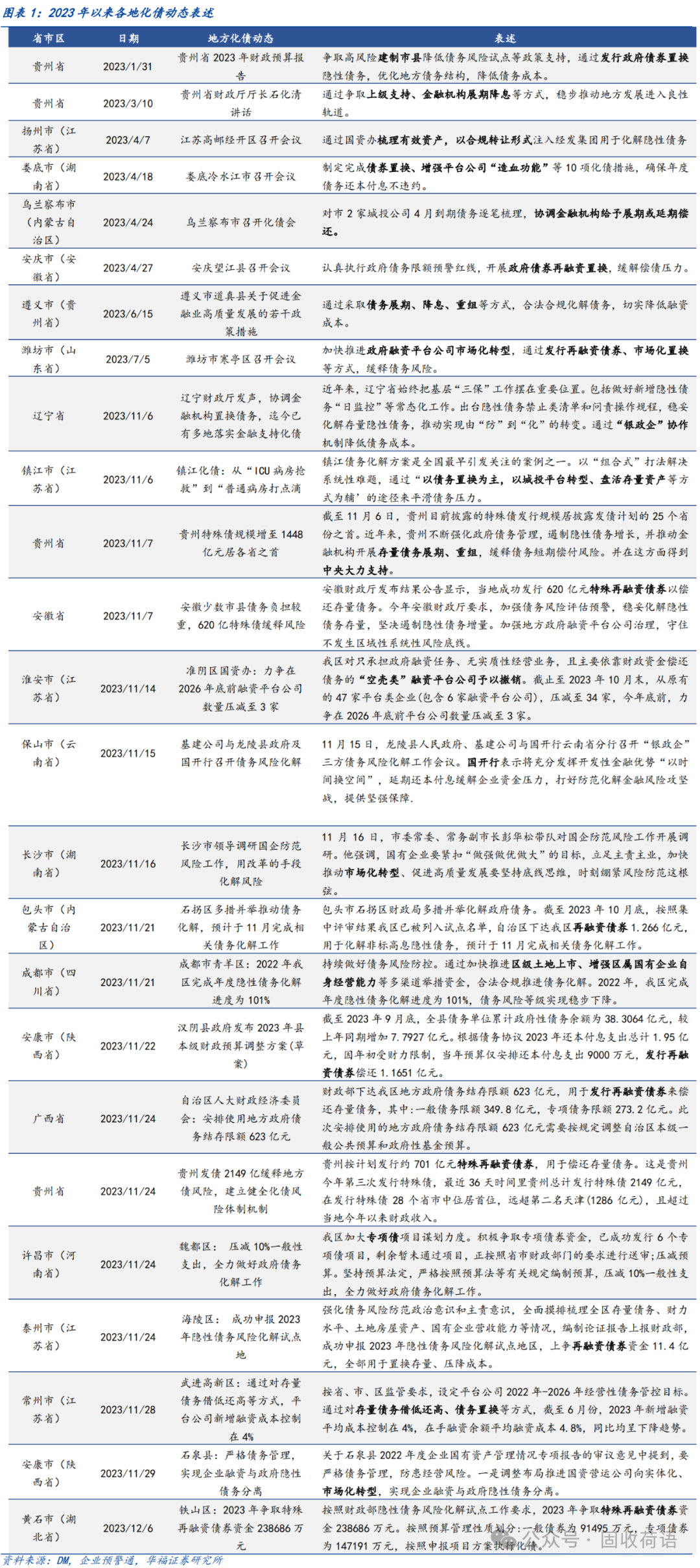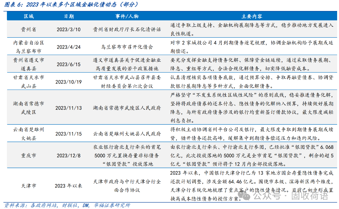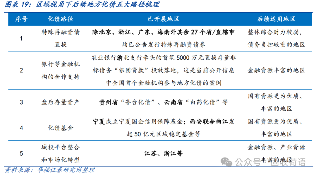 財政部《地方全口徑債務清查統計填報說明》中提出六種常見的債務化解舉措,具體為(1)安排財政資金償還;(2)出讓政府股權以及經營性國有資產權益償還;(3)利用項目結轉資金、經營收入償還;(4)合規轉化為企業經營性債務;(5)通過借新還舊、展期等方式償還;(6)采取破產重整或清算方式化解。同時,根據各地化債動態表述,各地根據自身情況,積極探索了金融機構貸款置換、城投平臺整合或轉型、特殊再融資債置換、設立化債基金等方式推動化債進程。