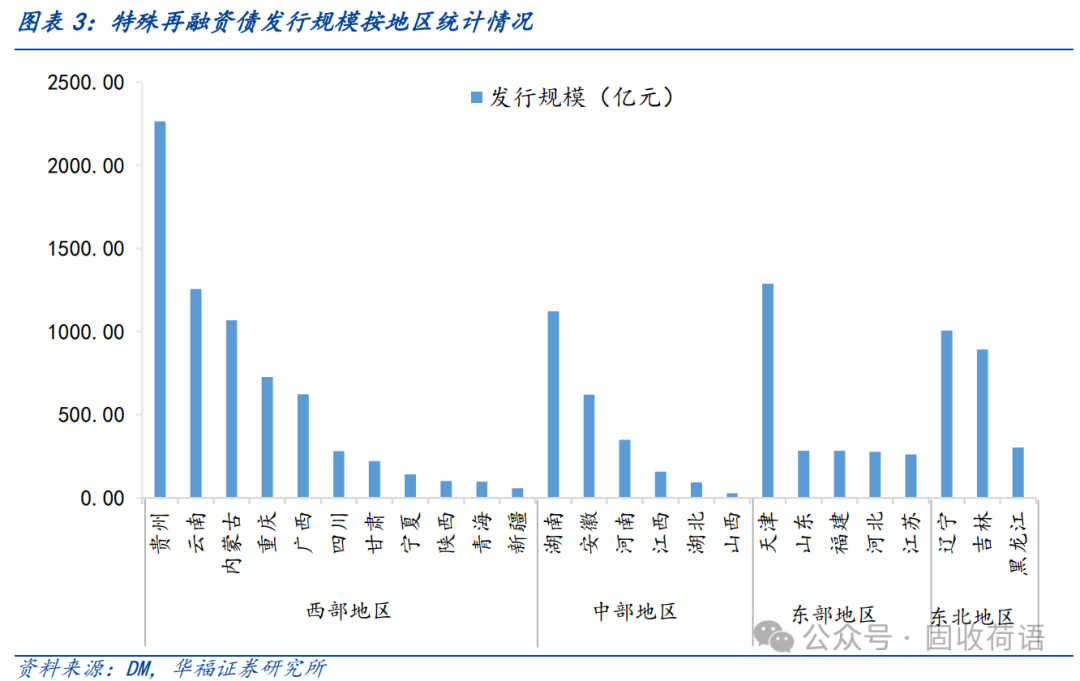 發行集中在西部地區。相較于東、中部地區,西部地區整體綜合財力較弱,債務負擔較重,因此在上級支持方面存在較大優勢。