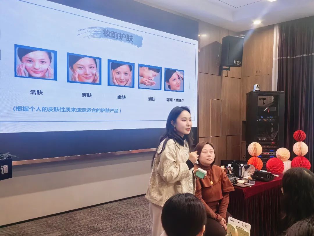課堂上,專業美妝老師以細膩的筆觸和專業的視角,系統地解析了職場與生活雙場景下的妝容公式。她強調,底妝是整體妝容的基石,不同膚色適合的底妝色號各不相同,精準選擇能讓妝容更加自然和諧。從職場著裝到妝容設計,從理論剖析到實操技巧,從眉形勾勒到腮紅暈染,通過現場演示,將每一個步驟都講解得細致入微。她手把手地指導,幫助在場的每一位女神擺脫“手殘”的困擾,傳授實用的化妝技巧,耐心解答每一個疑問。