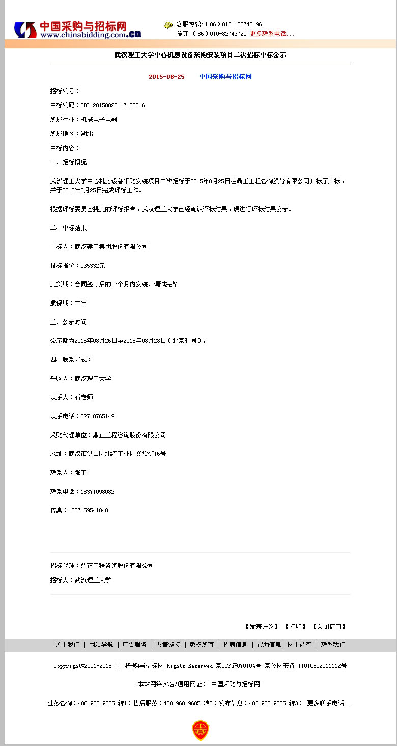 武漢理工大學(xué)中心機(jī)房設(shè)備采購安裝項目二次招標(biāo)中標(biāo)公示