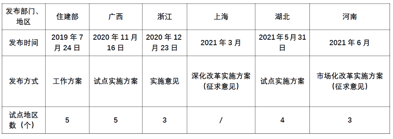 2020年7月24日,住房和城鄉(xiāng)建部辦公廳印發(fā)關(guān)于工程造價(jià)改革工作方案的通知(建辦標(biāo)〔2020〕38號(hào),以下簡(jiǎn)稱38號(hào)文),通知決定在北京市、浙江省、湖北省、廣東省、廣西壯族自治區(qū)等五個(gè)地區(qū)開(kāi)展方案試點(diǎn)工作。截至本稿起筆日(2021.6.3),廣西、浙江和湖北等三個(gè)試點(diǎn)地區(qū)相繼發(fā)布有關(guān)方案通知,北京、廣東尚未見(jiàn)官方相關(guān)信息。五個(gè)試點(diǎn)城市外,上海、河南等地的方案在征求意見(jiàn)中。