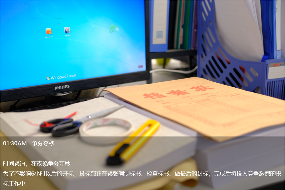 凌晨1點,投標部毓兒還在趕標書,這是她這個月第五份標書,已經連續熬了四個晚上。她說:“對于投標人說,有一大半的標書,都是在半夜里完成的。尤其是臨近開標的前兩天,基本都會加班到很晚。”