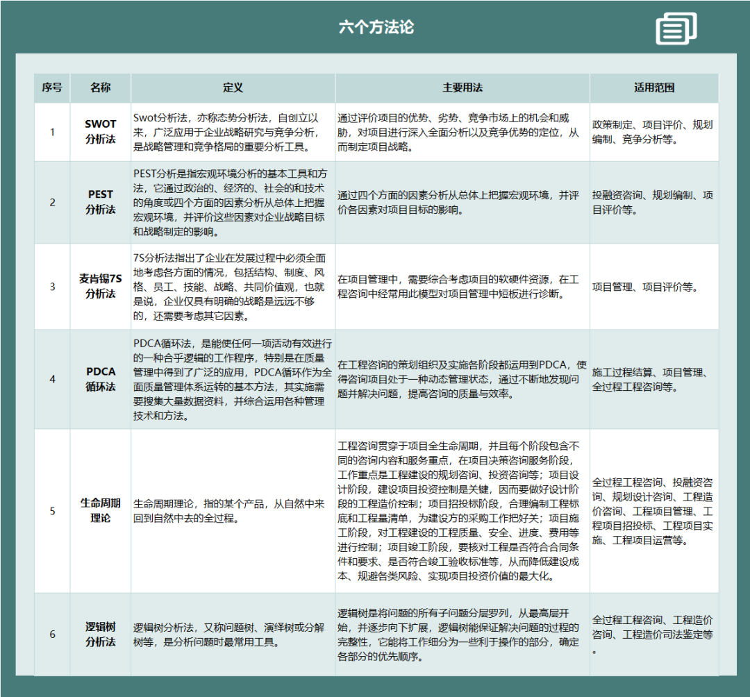 在理念更新迭代以后,行動必須緊緊跟上。王志綱老師曾說:“我手中掌握的超級法寶,就是方法論。只有掌握了正確的方法論,才能做到海納百川,消化一切。” 因此,作為一家工程咨詢服務機構,工作方法論便是幫助我們更好地診斷、研判、分析、實操項目的獨門秘方。