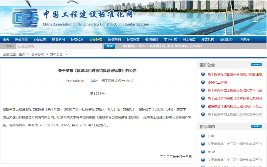 鼎正參編的《建設項目過程結算管理標準》(T/CECS 1178-2022)正式發布