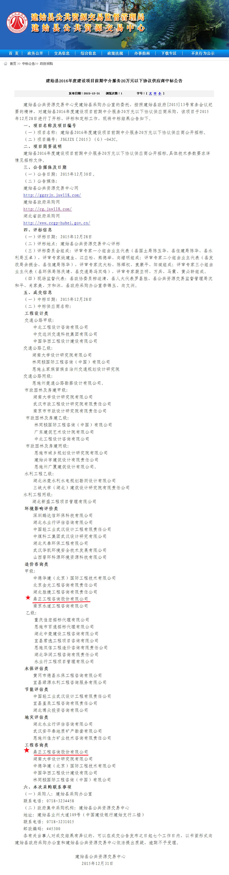 【經營成果】我司入選建始縣2016年度建設項目前期中介服務20萬元以下協議供應商
