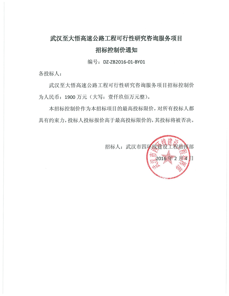 武漢至大悟高速公路工程可行性研究咨詢服務(wù)項(xiàng)目招標(biāo)控制價(jià)通知