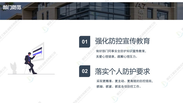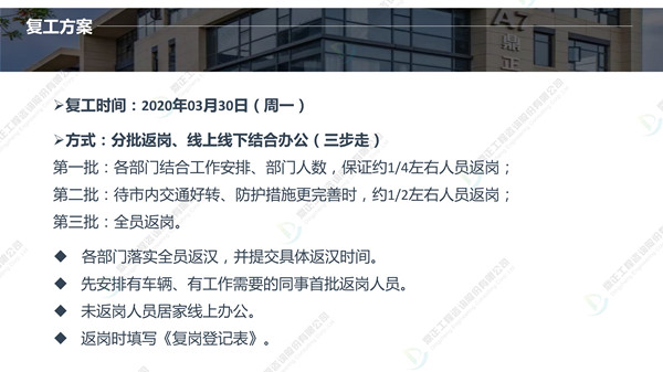 分批返崗、線上線下結(jié)合辦公,鼎正人的復(fù)工準(zhǔn)備工作正有序進行。在疫情防控、復(fù)工復(fù)產(chǎn)兩手抓的同時,鼎正咨詢將一如既往地為客戶提供專業(yè)的全過程工程咨詢服務(wù)。