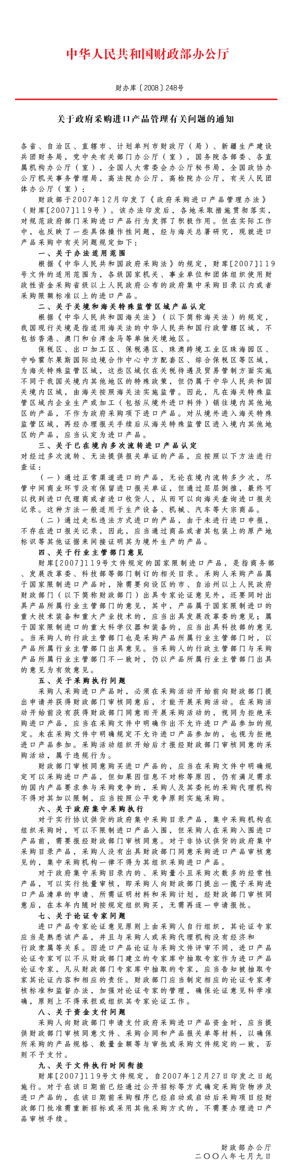 關(guān)于政府采購(gòu)進(jìn)口產(chǎn)品管理有關(guān)問(wèn)題的通知(財(cái)辦庫(kù)〔2008〕248號(hào))